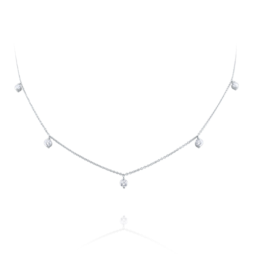 5 Diamond hanging necklace set in 14k solid gold available in 16" or 18" chain with a secure lobster clasp. This item has a lead time of approx 2 weeks.