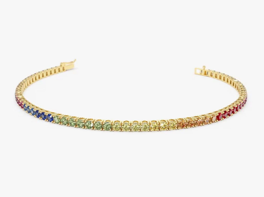Set in solid 14k yellow gold. This is the perfect rainbow sapphire tennis that won't flip and is secured with a double clasp. This comes in a 6.5" yellow gold but available larger and in white gold upon special request.